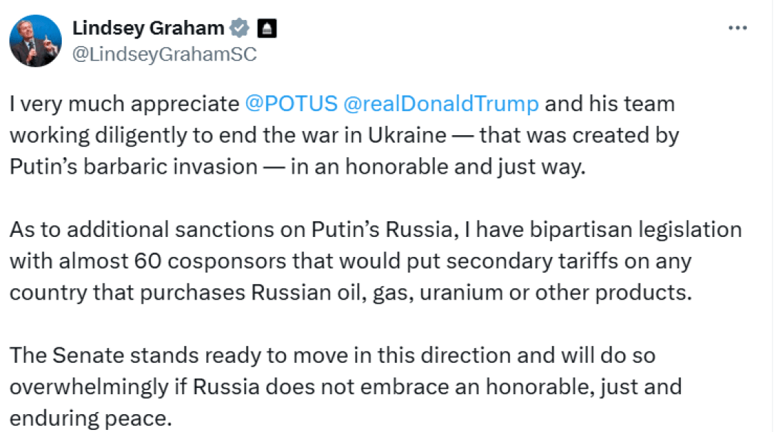 “Що стосується додаткових санкцій проти путінської Росії, то у мене є двопартійний законопроєкт з майже 60 співавторами, який накладає додаткові тарифи на будь-яку країну, яка купує російську нафту, газ, уран або інші продукти”, — написав Грем.