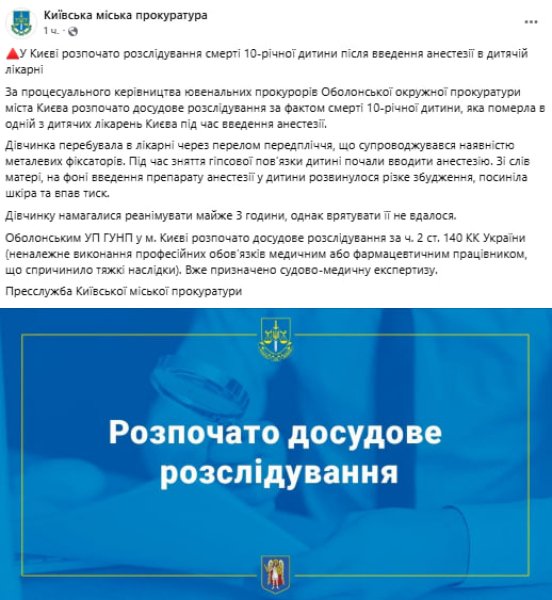 У Києві відкрито кримінальне провадження через смерть 10-річної дівчинки під час введення анестезії в одній із дитячих лікарень. Слідство з’ясовує обставини трагедії та можливу неналежну медичну допомогу.