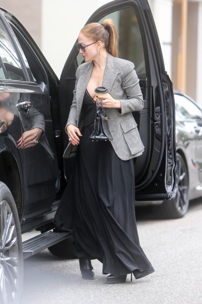 Згодом фотографи помітили, як Лопес заходила в авто, накинувши на плаття піджак у ялинковий принт і тримаючи в руках напій.