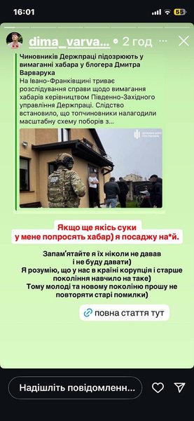 У своєму Instagram блогер повідомив, що стало відомо про вимагання коштів від керівника установи, який розповів про візит представників Держпраці. За словами Варварука, чиновники використали скрутний фінансовий період фірми та популярність власника, натякаючи на можливі труднощі у випадку відмови “порозумітися”.
