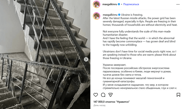 Галкін розмістив звернення, в якому докладно описав наслідки зупинки української енергетичної системи. За його словами, після останніх потужних ударів тисячі будівель, зокрема в столиці, залишилися без опалення та електрики.