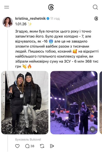 Нова хвиля обурення з’явилася після публікацій Христини Решетнік у січні 2026 року з відпочинку в Буковелі. У публікаціях ішлося про участь у великих заходах, відкриття великого готельного комплексу та збір мільйонів гривень на потреби ЗСУ. Саме ці публікації спровокували шквал коментарів із питаннями про невирішену ситуацію зі звітністю за попередній збір.
