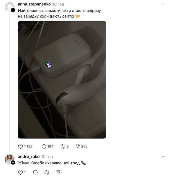 - “Відверто кажучи, не гадала, що вібратори можуть віддавати тепло на рівні ТЕЦ, але гаразд, живемо в країні інновацій — тут людям замість рішень видають “лайфхаки”. І тут в мене чоловіки запитують: а їм що робити? Може пані продемонструє, як це функціонує? Бо без наочного посібника ми не зрозуміємо, скільки штук потрібно на двокімнатну, і чи є режим “обігрів приватного сектору”;