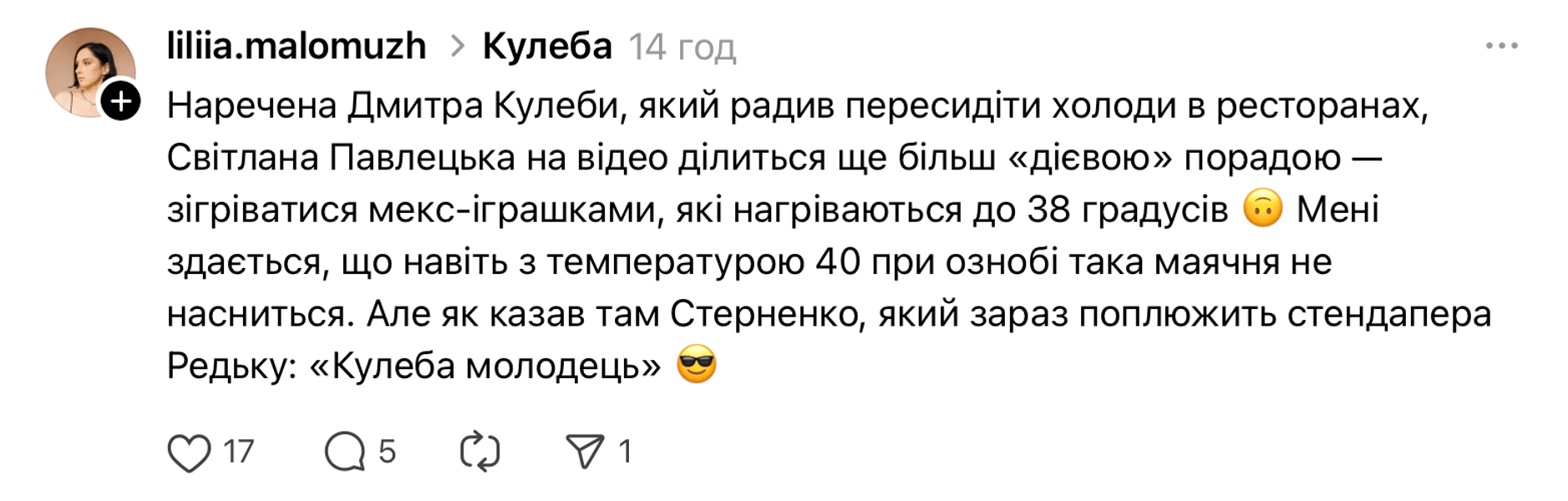 - “Це зухвалий ляпас кожному, для кого ця зима стала питанням фізичного виживання. Зневага тисячам сімей, у оселях яких темрява триває по десять годин і більше, і доводиться вдома перебувати у верхньому одязі”;