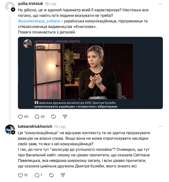 Павелецька, яка є супутницею ексміністра Дмитра Кулеби, ділилася думками на цю тему в інтерв’ю ютуб-каналу “Це Ніхто Не Буде Дивитись”, зйомки якого відбулися ще в листопаді.