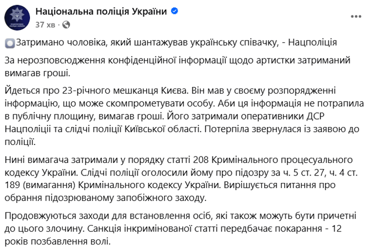 “За нерозголошення приватної інформації щодо артистки затриманий вимагав грошові кошти. Мова йде про 23-річного жителя Києва. Він володів інформацією, яка могла поставити під сумнів репутацію особи. Щоб ця інформація не стала публічною, вимагав гроші. Його затримали співробітники ДСР Нацполіції та слідчі поліції Київської області. Постраждала звернулася із заявою до поліції”, — зазначено в повідомленні.