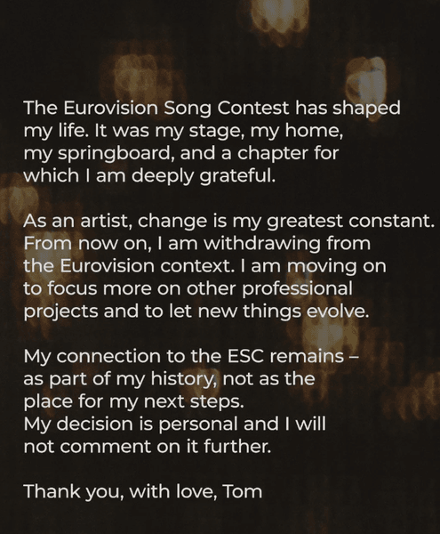 Артистка висловила сердечну подяку конкурсу за вплив на її долю, підкресливши, однак, що цей етап історії назавжди залишиться у минулому.За словами Вурст, зараз вона має намір цілком зосередитися на інших починаннях і направити всі зусилля на їх розвиток. Артистка попередила шанувальників, що вони більше не побачать її ані на головній сцені змагання, ані на пов’язаних з ним подіях. Вона охарактеризувала свій вибір як суто особистий і зазначила, що не планує пояснювати його мотиви або коментувати його додатково.