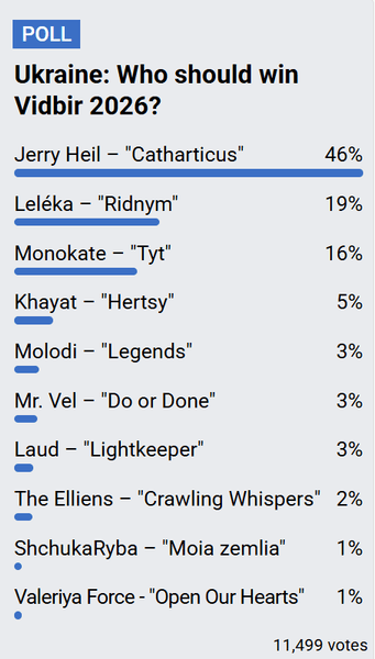 Виходячи з результатів опитування на сайті Eurovisionworld, першість у Відборі-2026 з відчутною перевагою прогнозують Jerry Heil. Другу та третю позиції отримали Leléka та Monokate.