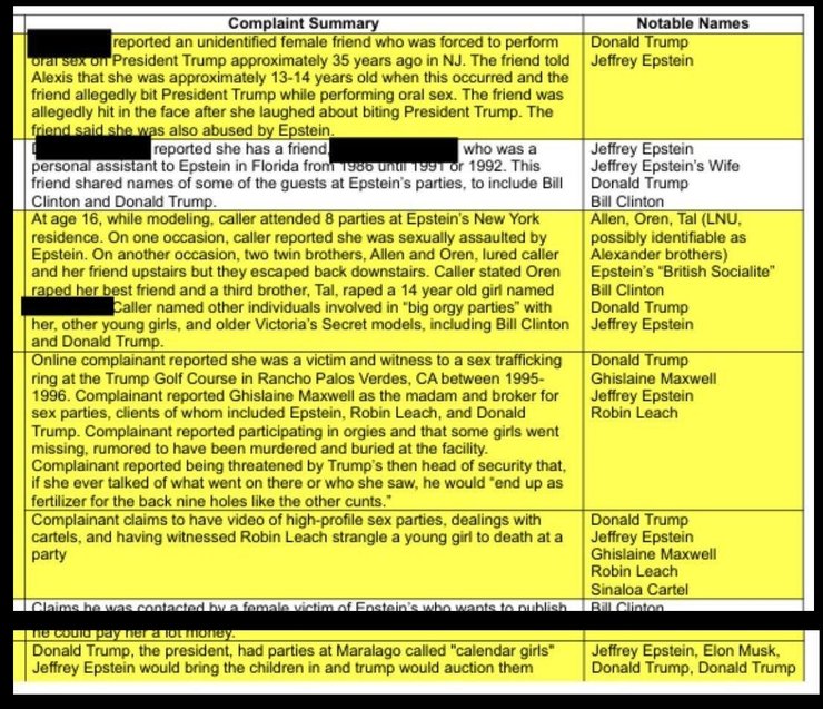 Американське міністерство юстиції розмістило на своєму ресурсі мільйони нових документів у справі покійного фінансиста Джеффрі Епштейна, якого звинувачували в торгівлі людьми. У документах безліч разів згадується прізвище Дональда Трампа, його соратника Стіва Беннона, Білла Гейтса та інших відомих політиків і знаменитостей. Представлені фотографії, відео, анонімні та частково анонімні звернення свідків, а також свідчення потерпілих від насильства. Зараз журналісти досліджують документи.