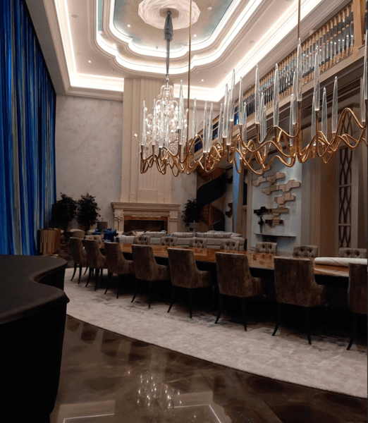 Ключовим підрядником була компанія “Кредо”, яка раніше вже відповідала за будівництво як офіційних, так і таємних резиденцій Путіна. Головна будівля дивує розкішшю: кімнати оздоблені мармуром та золотими елементами, а один лише кран у ванній з квітковими мотивами коштує понад 2,8 млн рублів, і таких у приміщенні — 15 одиниць, на загальну суму у понад 11 мільйонів. В іншій ванній кімнаті, яка, ймовірно, створювалася вже як чоловіча, замість квітів — дракони. Набір фурнітури там обійшовся у 11,2 мільйона.
