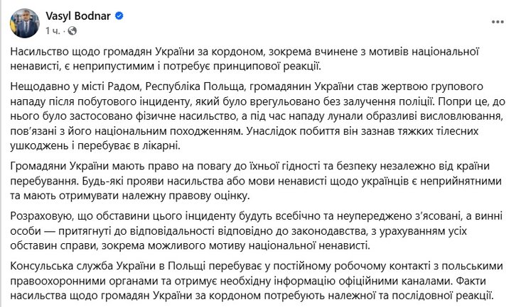 “Громадяни України мають право на повагу до їхньої гідності та безпеки, незалежно від місця їхнього перебування. Будь-які форми насильства або прояви ненависті щодо українців є абсолютно неприйнятними і мають бути належним чином оцінені правовою системою. Сподіваюся, що обставини цієї події будуть всебічно та неупереджено розслідувані, а винні особи будуть притягнуті до відповідальності згідно з чинним законодавством, з урахуванням усіх аспектів справи, включаючи ймовірний мотив національної ворожнечі”, — підкреслив він.