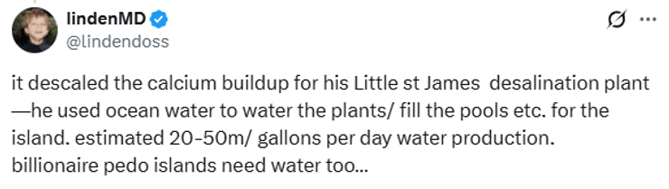 “Вона усувала наліт з кальцієвих відкладень на його опріснювальній системі на острові Літл-Сент-Джеймс — він застосовував морську воду для поливу рослинності/наповнення басейнів тощо на острові. Орієнтовна продуктивність складала 20-50 мільйонів галонів води на добу. Островам багатіїв-педофілів також необхідна вода…”, — додає інший дописувач.