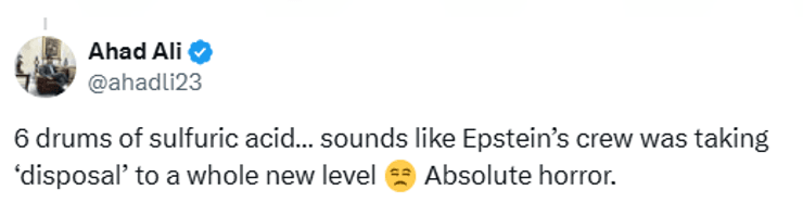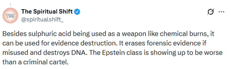“Джеффрі Епштейн замовив сірчану кислоту у 2018 році, можливо, щоб розчиняти тіла дітей”, “Єдиний спосіб використання цієї речовини — розчинення тіл”, “6 бочок сірчаної кислоти… виглядає так, ніби команда Епштейна вивела “утилізацію” на новий рівень. Абсолютний жах”, “Окрім застосування сірчаної кислоти як зброї, на зразок хімічних опіків, її можливо застосовувати для усунення доказів. При невідповідному використанні вона руйнує докази та ДНК. Схоже, “клас Епштейна” гірший, ніж злочинний синдикат”, — коментують юзери.
