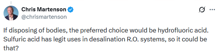 Інші висловили думку, що якби Епштейн хотів позбавлятися тіл, то більш ефективним варіантом була б плавикова кислота. Користувач Кріс Мартенсон припускає, що замовлена Епштейном сірчана кислота могла бути застосована для очищення його систем зворотного осмосу, оскільки це є одним із “легальних варіантів використання” цього хімікату.