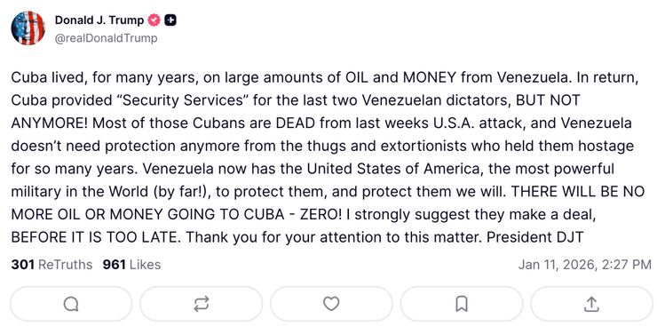 Керівник Білого дому заявив, що Куба тривалий період часу існувала завдяки нафті та коштам із Венесуели, надаючи натомість послуги безпеки венесуельським правителям. Однак зараз, за словами Трампа, Венесуела не потребує подібних послуг від “бандитів і вимагачів”, адже державу захищатиме американська армія. Відповідну заяву Трамп оприлюднив на своїй сторінці в соціальній мережі Truth Social.