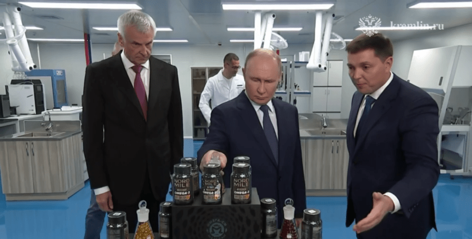 Повідомляється, що російський диктатор відвідав завод “Омега-Сі”, який займається переробленням і рафінуванням риб’ячого жиру та виробляє добавки у вигляді капсул з вітаміном Омега-3. Жир добувають з білої риби Охотського моря, а саме — з сардини та оселедця.