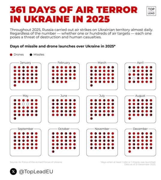 «Для тих, хто ще вагається – графік російських бомбардувань України: 361 день із 365!», – відзначила Матернова, висловивши побажання миру Україні у 2026 році.