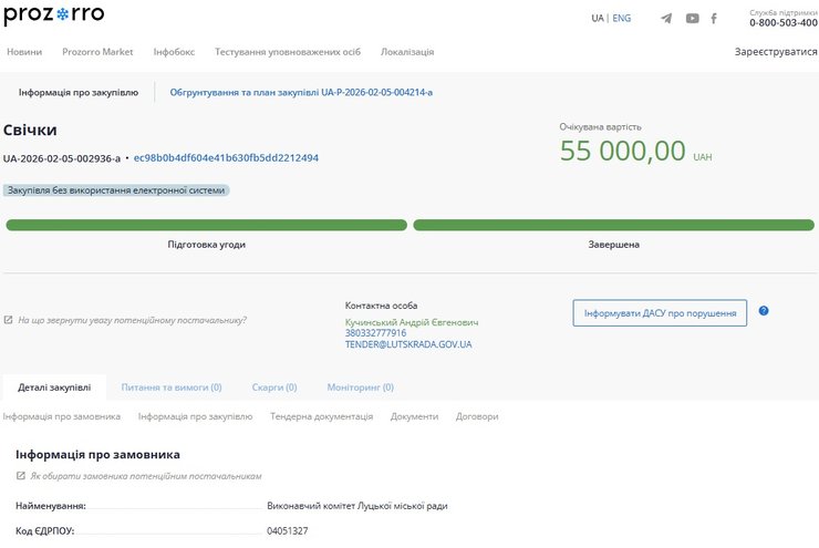Виконавчий орган Луцької міської ради провів конкурсні торги для придбання 100 ароматичних свічок на загальну вартість 55 тисяч гривень, що становить 550 грн за штуку.