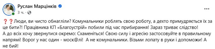 “Люди, ви зовсім знахабніли? Співробітники комунальних служб виконують свою роботу, а деякі умудряються їх за це бити?! Працівника КП “Благоустрій” побили під час виконання робіт по прибиранню! Наразі триває слідство! А до всіх хочу звернутися окремо: Одумайтеся! Свою силу та агресію застосовуйте у вірному напрямку!” — написав він, нагадавши, що на даний момент головний супротивник усіх українців — російські загарбники, а не працівники комунальних служб.