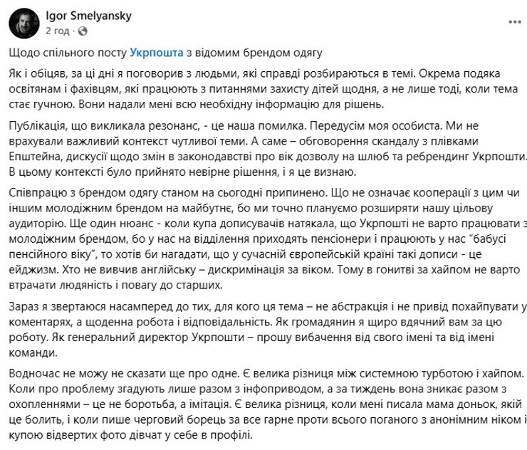 “Ми не взяли до уваги важливий контекст чутливої теми. А саме — обговорення інциденту з плівками Епштейна, дебати щодо поправок до закону про вік згоди на шлюб та ребрендинг Укрпошти. У цьому світлі було прийнято невірне рішення, і я це визнаю”, — йдеться в заяві.