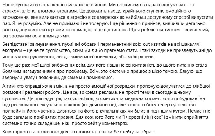 “Необґрунтовані звинувачення, публічні приниження та постійний sold out квитків на всі “шакалячі експреси” — це не те суспільство, яким ми є або прагнемо бути. І подібні дії не приведуть ані до чогось конструктивного, ані до зміни моєї поведінки чи моїх рішень”, — зауважив він.