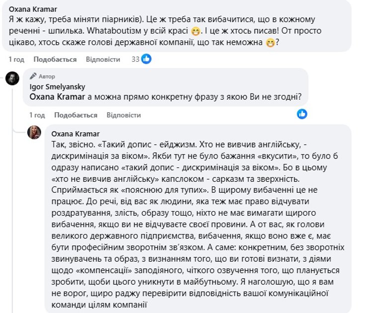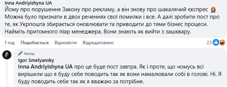 Це — не перший інцидент навколо підприємства та його керівника. За кілька діб до цього Ігор Смілянський різко відреагував на коментар користувачки, яка піддала критиці обґрунтованість зміни логотипу “Укрпошти”, враховуючи загальний стан поштових відділень та якість обслуговування.