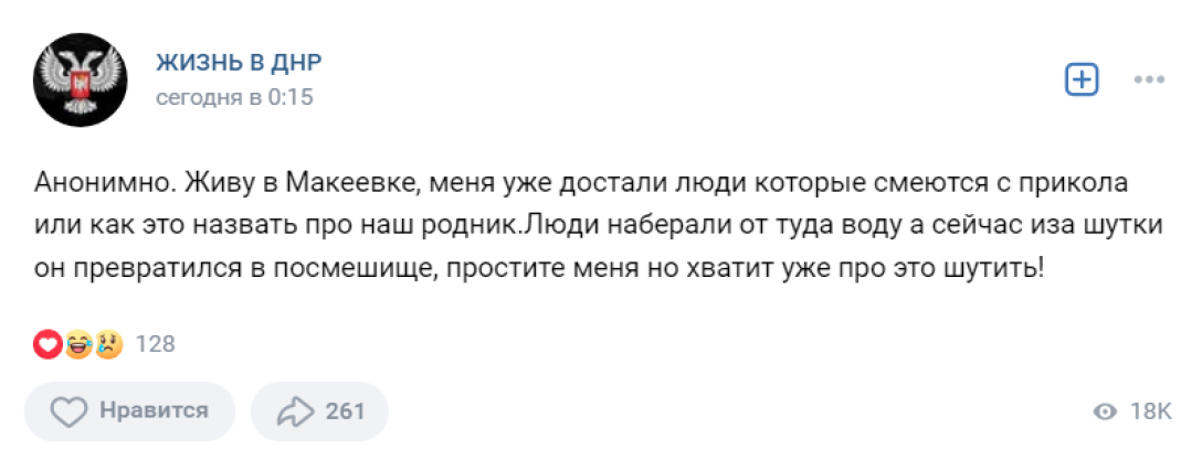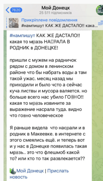 “Хтось нас*ав у джерельце в Макіївці на Об’єднаному, де люди набирають собі питну воду. Тварюка”.