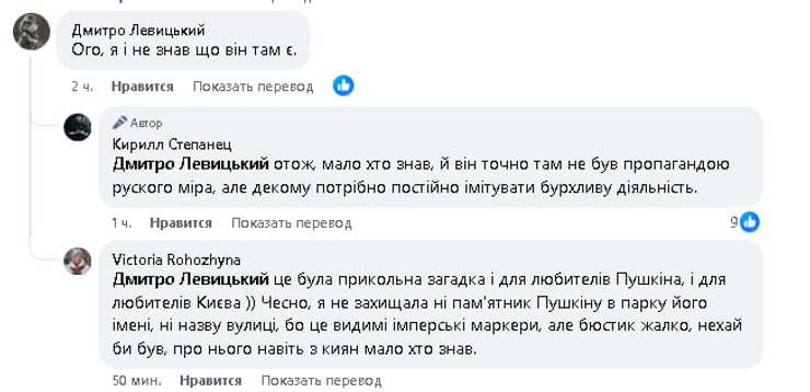 Деякі з коментаторів навіть відзначали, що раніше не знали про існування цього бюсту, і що він не був уособленням пропаганди “руського міра”, а лише частиною київської історії. Інша користувачка додала, що бюст міг би залишитися “цікавою загадкою” для киян та шанувальників Пушкіна, попри те, що вона не підтримує імперські символи в інших пам’ятках.