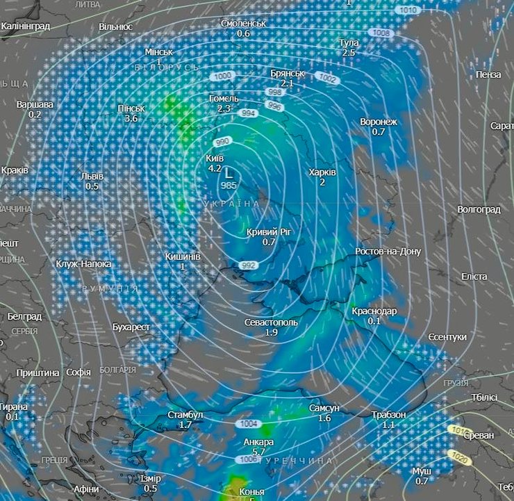 “Південний циклон “ULLI” є активним та інтенсивним і вже спричиняє негоду, про яку ми застерігали заздалегідь. Станом на 10 ранку циклонічний вихор знаходиться над Молдовою та переміщується з темпом 35 км/год у напрямку Балта-Умань-Канів і далі на Чернігів”, — зазначив Постригань.