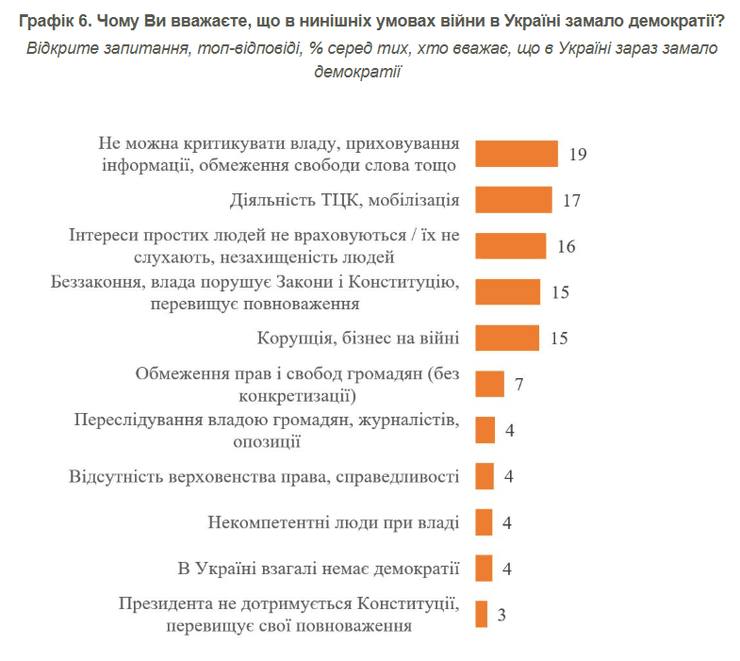 Оскільки питання мобілізації є чутливим, варто зазначити, що, якщо брати до уваги все населення, то лише 6% тих, хто вважає, що в державі мало демократії, пов’язують це з діями ТЦК.