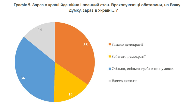 35% українців дотримуються думки, що в Україні недостатньо демократії, і це — на один відсоток менше, аніж тих, хто оцінює ступінь демократії відповідним до поточних умов (36%). Ще 16% вважають, що її надмірно багато.
