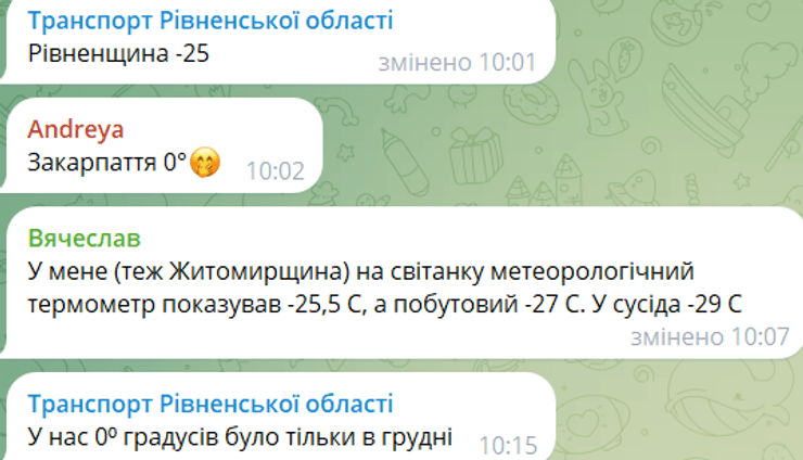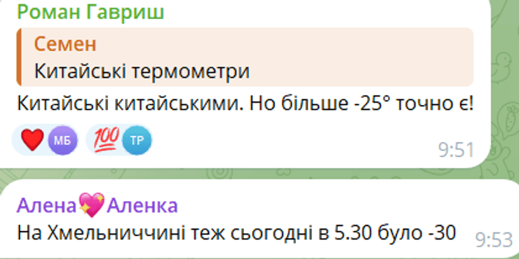 У коментарях під дописом користувачі підтверджують, що на Хмельниччині вранці також було зафіксовано -29 градусів, а в Житомирській області, за словами очевидців, морози варіювалися від -25 до -29 градусів. У Рівненській області позначки термометрів впали до -25.