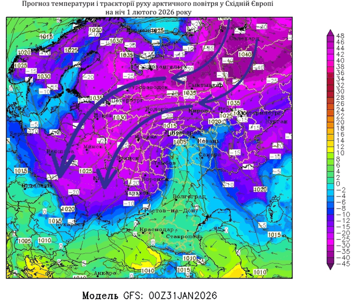 Пан Кібальчич додає, що з 1 по 4 лютого температурні значення на низинних місцевостях досягатимуть до -26…-31 °С. Вдень повітря нагріватиметься в межах -12…-18 °С, в південному регіоні України -6…-11 °С. Востаннє подібні температурні показники реєстрували у січні та на початку лютого місяця у 2006 році.