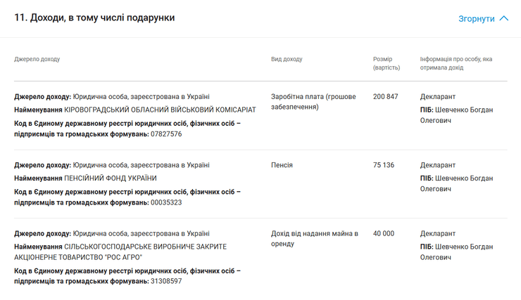 Окрім того, одночасно він отримав 75 тис. грн пенсійних виплат та дохід обсягом 40 тис. грн від здачі в оренду майна.