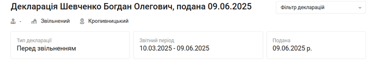 Шофер обласного Кіровоградського ТЦК Богдан Шевченко отримав 200 847 грн зарплатні. Подібні відомості фігурують в документі, поданому чоловіком перед відставкою.