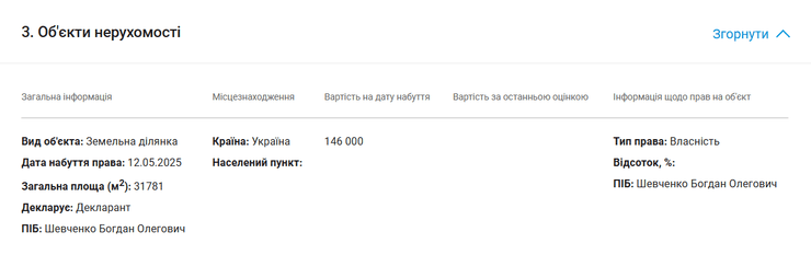 Зазначається, що у травні 2025 року чоловік за 146 тис. грн. став власником земельної території загальною площею 31 781 “квадрат”.