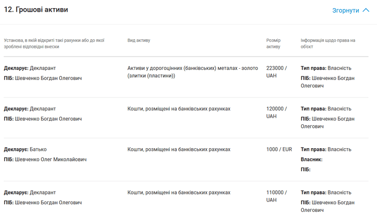 У декларанта наявні золоті пластини загальною вартістю 223 000 грн, а на банківських рахунках знаходяться 120 000 та 110 000 гривень.